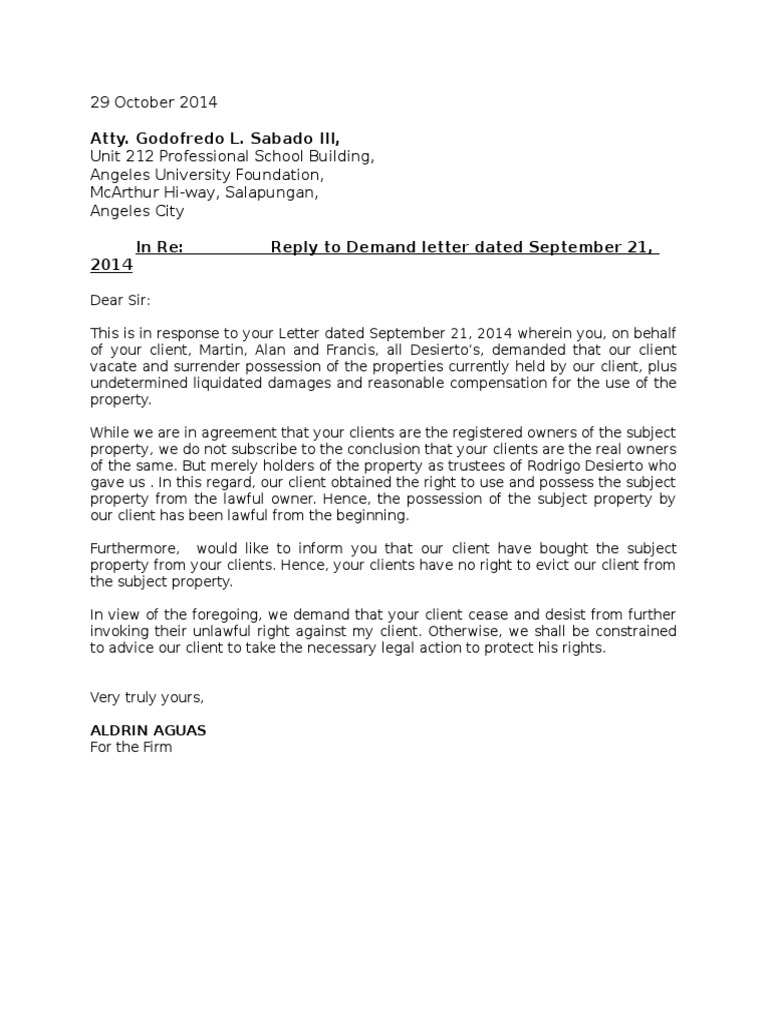Demand Letter To Vacate Sample Philippines ... from idoc.pub Your side of the story. A demand letter, or letter of demand (of payment), is a letter stating a legal claim (usually drafted by a lawyer) which makes a demand for restitution or performance of some obligation, owing to the recipients' alleged breach of contract, or for a legal wrong. You'd be surprised how often a simple demand letter can work without you having to go to court. Writing effective replies to business emails is one of the most important skills you should acquire as a good business owner, sales person or marketing personnel. Demand letter to vacate informal settlers vand reply. This demand letter for payment is available for free on upcounsel. When writing your demand letter, keep your goal in mind. The demand letter must also contain the amount for which you are suing or the specific relief you seek.